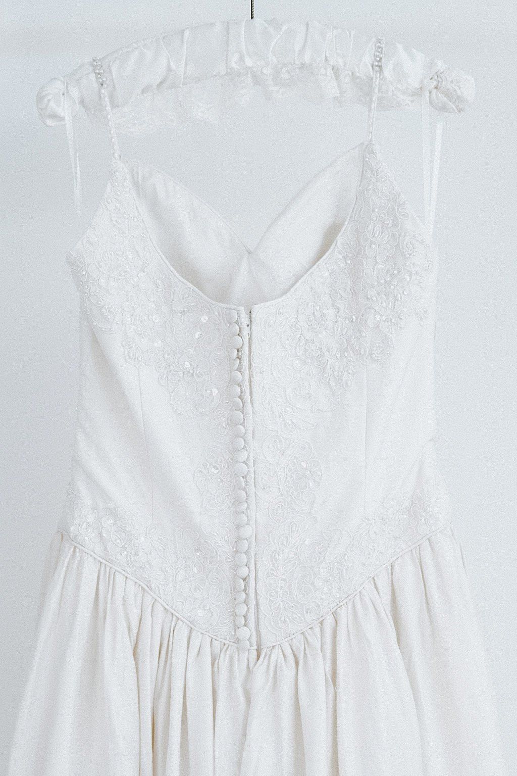 The lace top was attached to the original bodice and the center back was lined up with the top of the zip. This was finished off with loops and satin buttons to match the original dress.