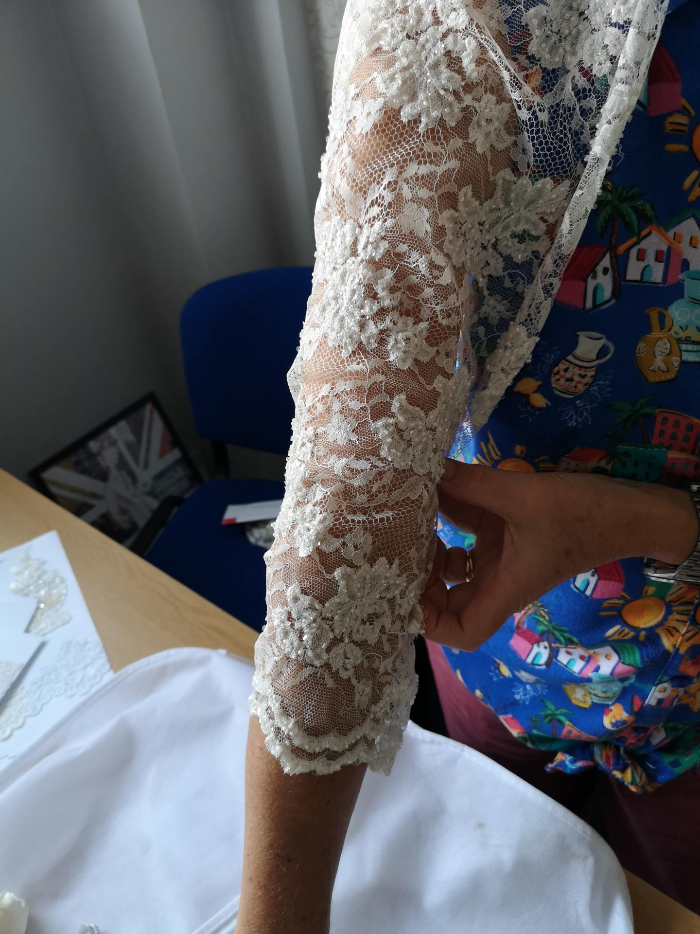 The bride wanted her shoulders and arms covered and by making a pattern to fit the original bodice she created a natural extension of lace flowing up to the shoulders and into the sleeves.