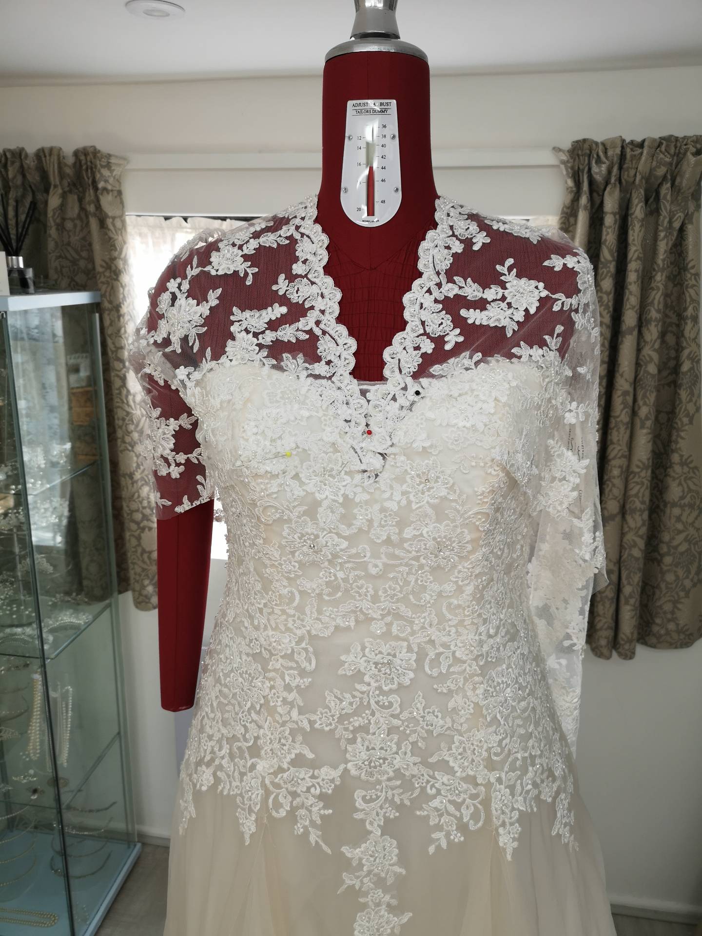 This wedding dress was perfect for restyling, it had a beautiful lace bodice which Caroline managed to find a suitable lace to compliment.